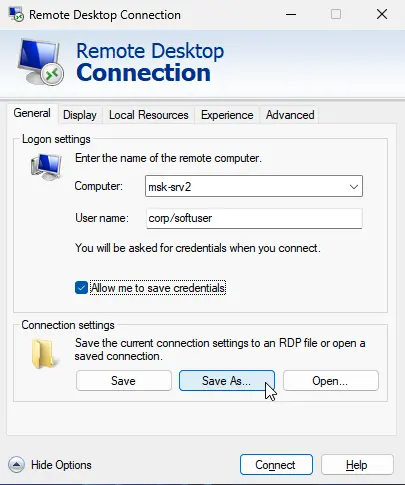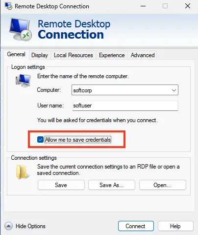 By default, Windows allows users to save passwords for RDP connections. In the Remote Desktop Connection (mstsc.exe) client, enter the remote computer’s name, credentials, and check the Allow me to save credentials option. After clicking Connect, the RDP server prompts for the password, which is stored in the Windows Credential Manager, not in the .RDP file.