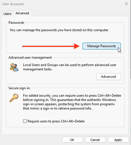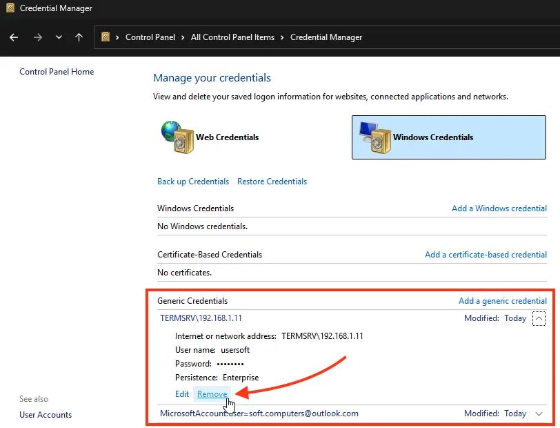 4. Delete all saved passwords in the Windows Credential Manager. Run control userpasswords2, go to the Advanced tab, and click Manage Passwords. In the opened window, select Windows Credentials and remove all saved RDP passwords (starting with TERMSRV/…).