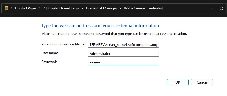 From this window, you can manually add credentials for RDP connections. The server name must be in the format TERMSRV\server_name1. After clearing the RDP connection history, ensure saved passwords are removed.