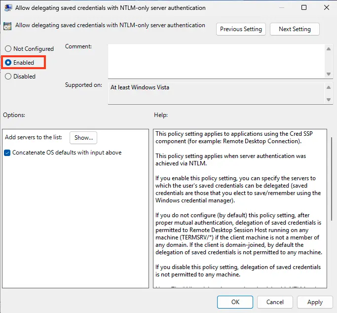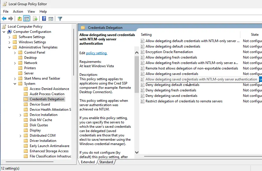 3. Locate the policy Allow delegating saved credentials with NTLM-only server authentication.