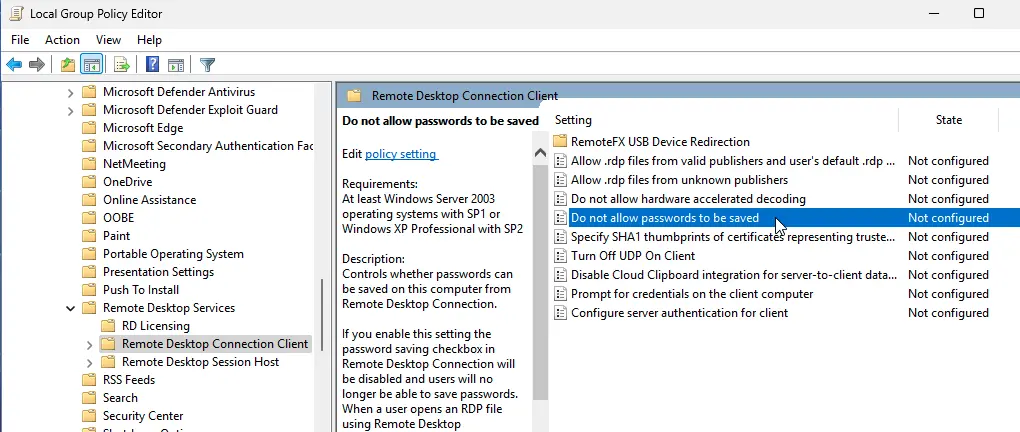 3. In the Local Group Policy Editor (gpedit.msc), navigate to Computer Configuration → Administrative Templates → Windows Components → Remote Desktop Services → Remote Desktop Connection Client. Ensure the Do not allow passwords to be saved and Prompt for credentials on the client computer policies are disabled or not configured. Check the resultant policy on your computer using the gpresult command.