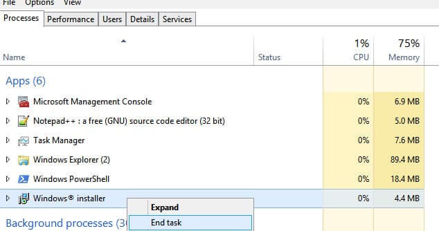 This command stops the Windows Installer (msiserver) process, which may be blocking the installation.