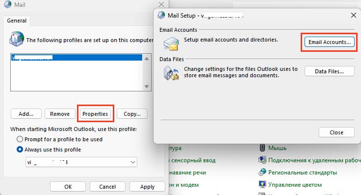 5. Select your Outlook profile, click “Properties” and then click “Email Accounts”.