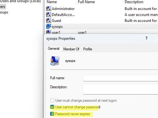 Get-LocalUser user1 | Set-LocalUser –PasswordNeverExpires $True -UserMayChangePassword $False