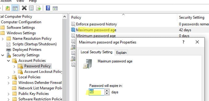 3. Set the Maximum password age parameter to 0 (the default is 42 days).