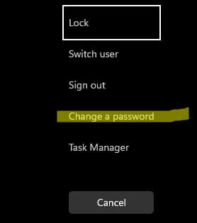 reg add "HKEY_CURRENT_USER\Software\Microsoft\Windows\CurrentVersion\Policies\System" /v DisableChangePassword /t REG_DWORD /d 1 /f